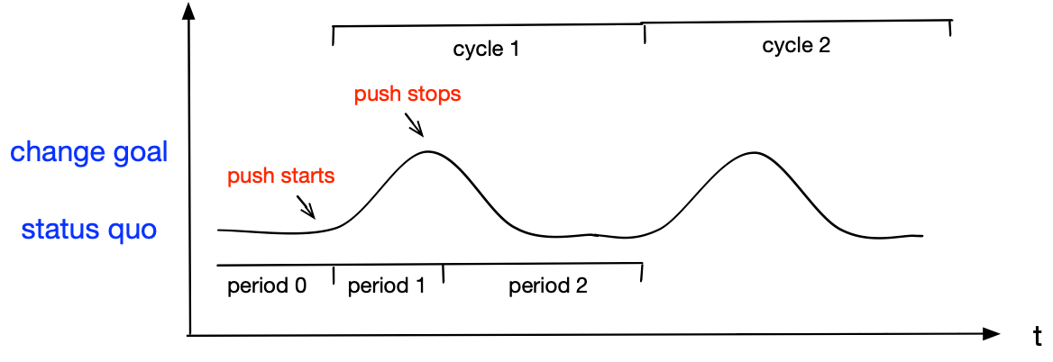 To understand why change fails this way, we first draw the following BOT graph, which shows two distinct periods in each push-and-regress cycle.