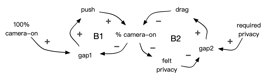In the following CLD, I replace the general status quo with a specific force of privacy. Gap 2 is not any more the gap in camera-on time, but the gap between the actual felt privacy and the desired privacy. Consequently, unless the core privacy concern is addressed, the system will inevitably revert to the state of camera-off.