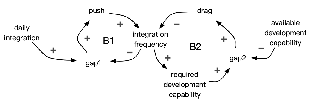 In the following CLD, I replace the general status quo with a specific force of development capability. Gap 2 is not any more the gap in integration frequency, but the gap between the required capability of developing in small batches and the available capability. Consequently, unless we build the capability of developing in small batches, the system will inevitably revert to the state of weekly integration.